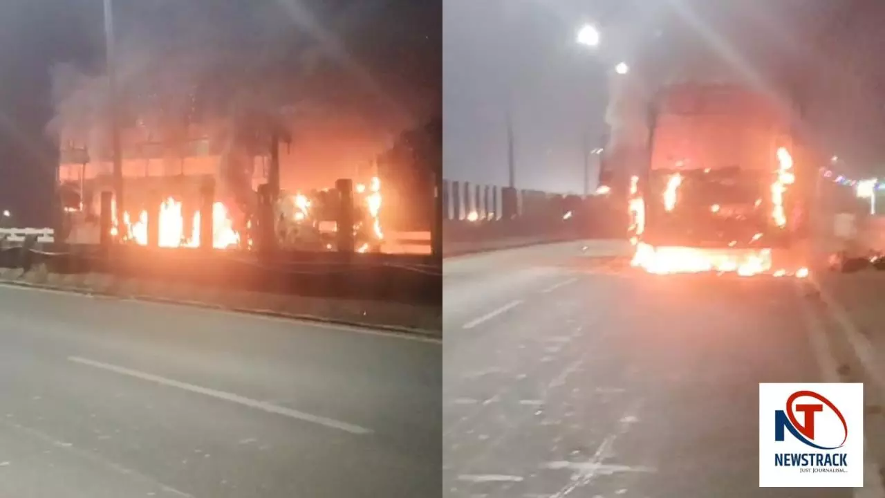 Mathura News: मथुरा के आगरा मथुरा बाईपास स्थित रिफाइनरी पुल पर उस वक्त सनसनी फैल गई जब एक चलती प्राइवेट बस को आग की लपटों ने घेर लिया।